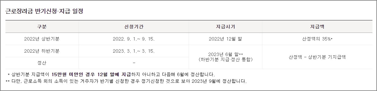 2022년 상반기분은 1월부터 6월까지에 해당됩니다. 9월 1일부터 9월15일까지 신청을 하며, 2022년 12월말에 지급이 됩니다. 산정액의 35%가 지급됩니다. 상반기 지급액이 15만원 미만인 경우 12월 말에 지급하지 않고 다음해 6월에 정산을 합니다. 다만, 근로소득 외의 소득이 있는 거주자가 반기별 신청한 경우 정기신청한 것으로 보아 2023년 9월에 정산합니다.