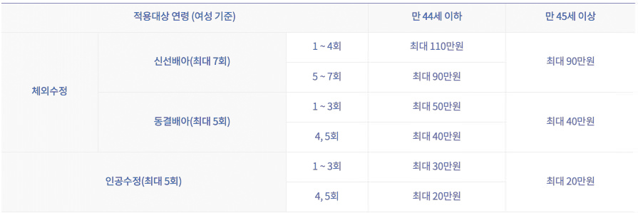 시험관은 정자와 난자를 각각 채취해서 수정을 시킨 후 배양하여 자궁에 이식하는 것을 말합니다. 신선배아는 과배란 주사 맞고 난자를 채취해서 바로 이식하는 게 신선배아이고, 동결배아는 채취한 난자를 얼렸놨다가 시간이 지난 후 이식하는 게 동결배아입니다. 무엇이 더 성공률이 높다기보다 보통 여자의 몸 상태에 따라서 결정되는 경우가 대부분입니다. 만 44세 이하는 최대 110만 원, 만 45세 이상은 최대 90만 원이 지원됩니다.