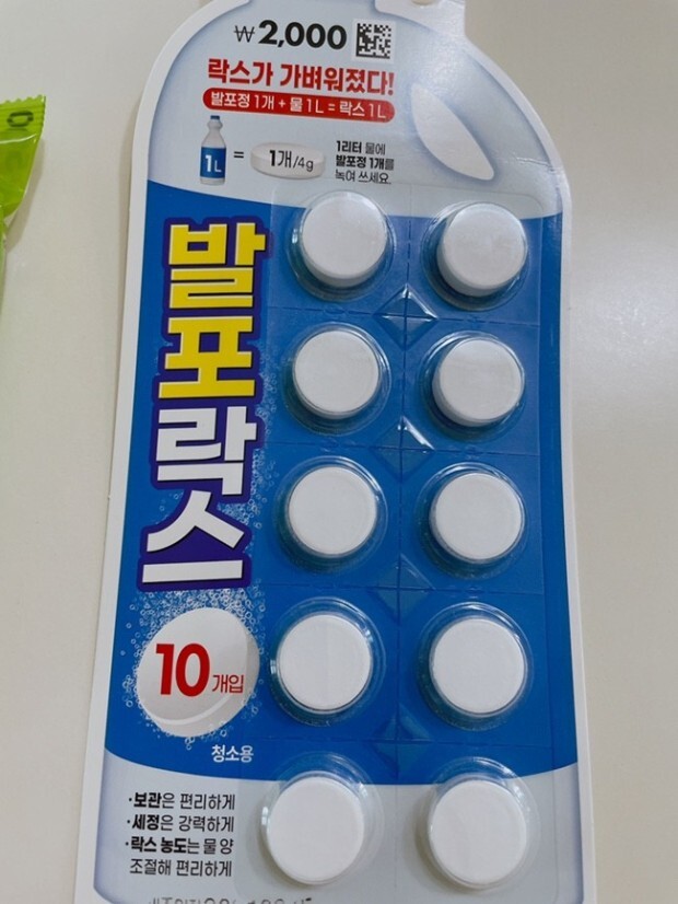 다이소에 방문하면 하나씩 꼭 사오는 제품입니다. 바로 발포락스 입니다. 기존에 우리가 마트에서 사던 락스는 무게도 나가고 화장실에 놓으면 자리도 차지해서 불편했었습니다. 하지만 발포락스는 사놓고도 유용하게 쓰이는 제품입니다. 물1L에다가 한알만 넣으면 같은 락스가 되어서 아주 좋은템인거 같습니다. 화장실에다가 한세트씩 놓고 쓰기에 좋은템 다이소에서 가격은 2000원 합니다. 가성비로는 최고 인거 같습니다. 또한 변기에다가도 한알씩 넣고 시간이 지난후 솔로 이리저리 닦으면 잘 닦이고 좋습니다.