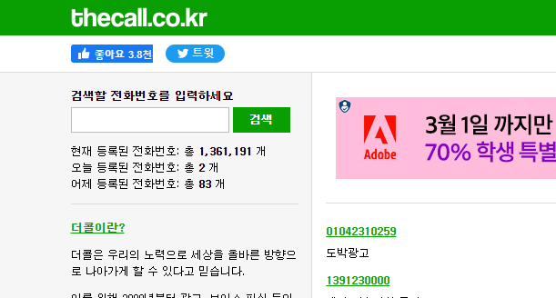 더콜은 2009년부터 서비스를 시작했으며 90만 개 이상의 전화번호가 등록된 사이트입니다.