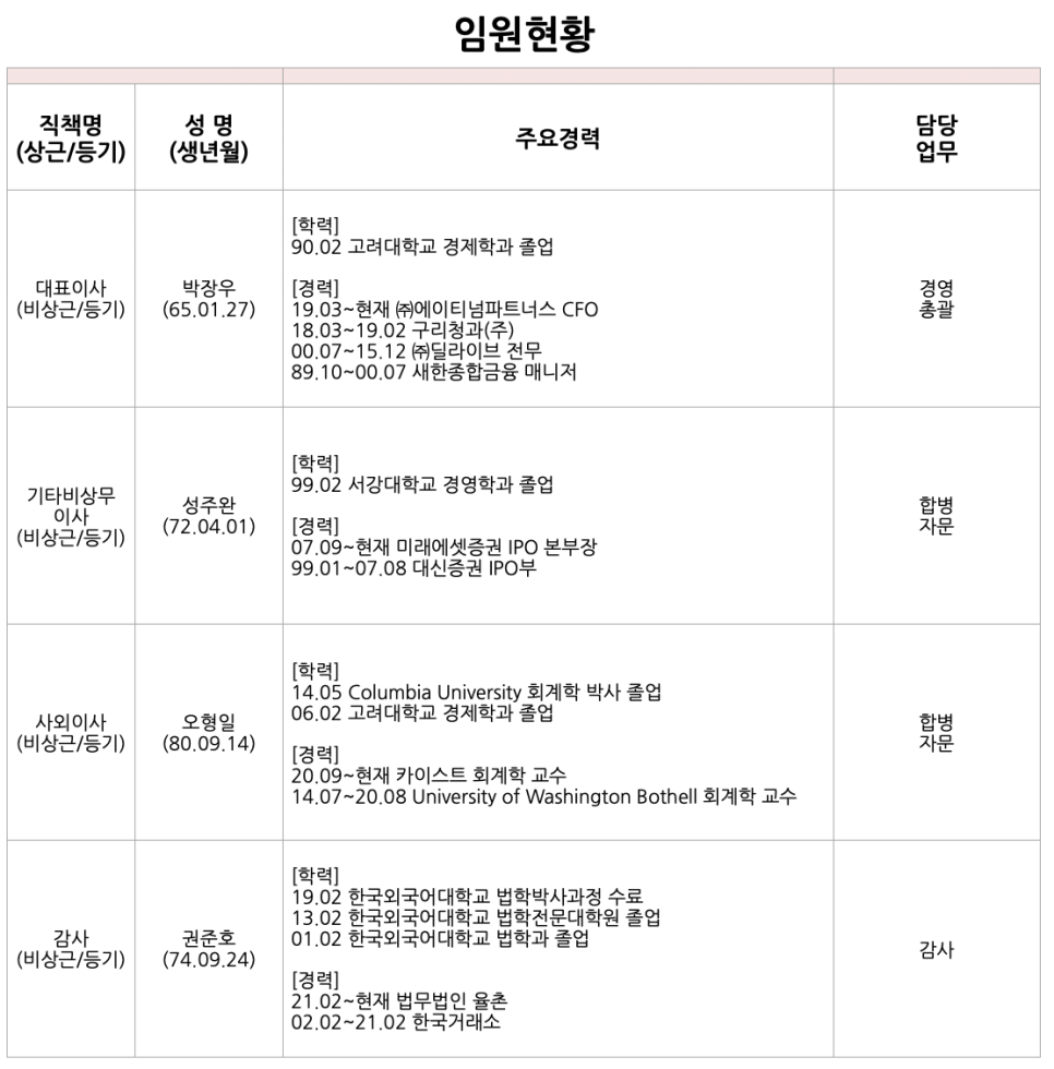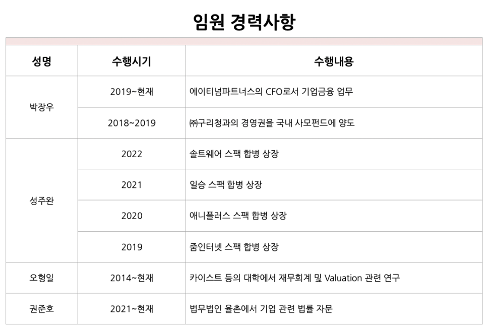 스팩은 기업의 인수합병 목적만을 가진 기업이기 때문에 일반 공모주와 달리 임원의 역량이 기업의 투자 포인트로 귀결된다고 볼 수 있습니다.