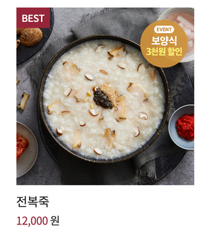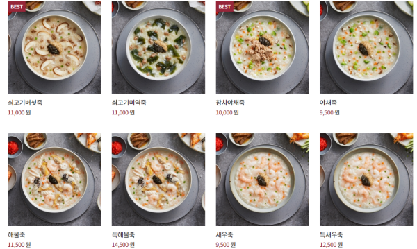 프리미엄 보양죽으로 전복죽, 전복내장죽, 트러플전복죽, 자연송이쇠고기죽 종류가 있습니다. 가격대는 일반 죽과는 5천 원 이상 차이가 나서 다소 부담스러울 수 있지만, 환자에게 대접하기엔 괜찮은 프리미엄 죽입니다.