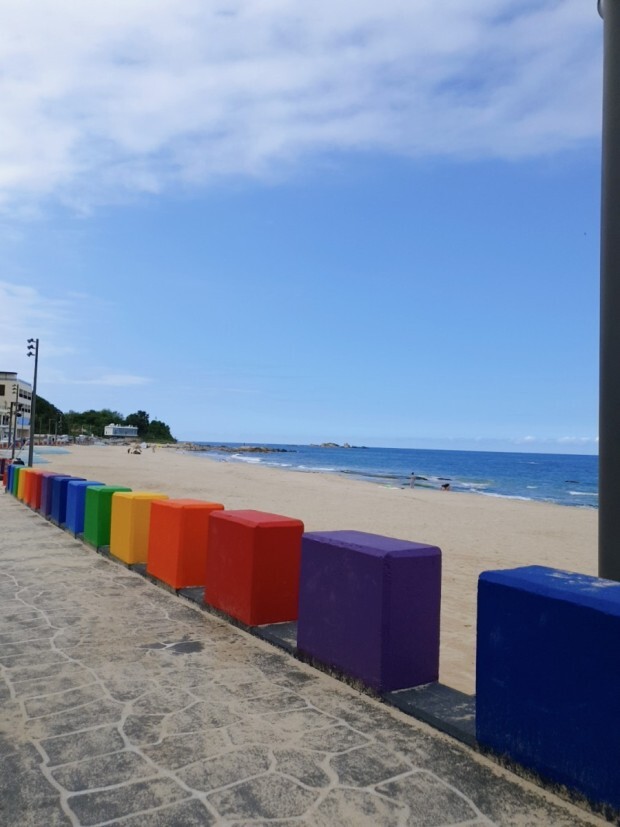 소개할 곳은 아야진 해수욕장 입니다. 위 사진처럼 빨주노초파남보 무지개 해안도로가 예뻐서 와보고 싶었어요실제로 보니 알록달록 더 귀엽더라구요! 이 무지개 도로만이 아야진 해변의 다가 아니었어요 에메랄드 색의 바닷물과 조개로 덮혀 검게 보이는 크고 작은 바위덕분에 여긴 마치 제주인가 싶가 싶더라구요 무지개 해안도로를 따라 올라가면 전망대가 있는데 그 풍경 또한 장관이에요 깨끗한 백사장과 파란 바다에 하얗게 부서지는 파도가 한눈에 내려다 보이는데 감탄이 절로 나와요.