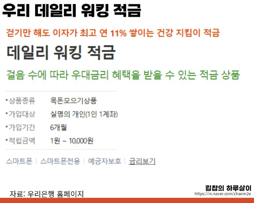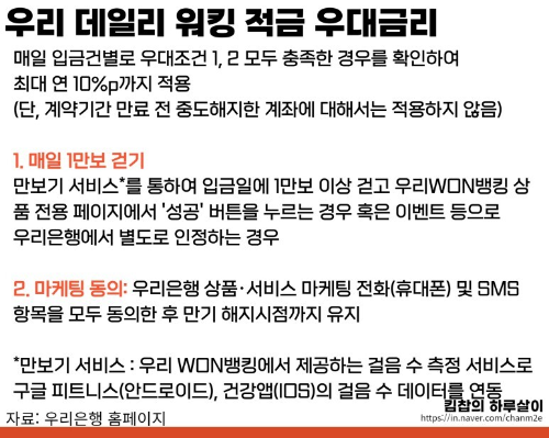 기본금리 1%에 우대금리가 10%인데 요건은 의외로 어렵진 않다. 하루 1만 보 이상 걸을 수 있으면 될 듯 합니다.