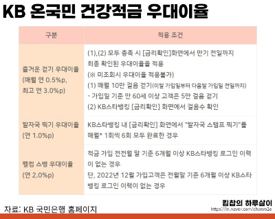 일단 우대금리 조건이 어떤지부터 살펴보니 그나마 달성 가능할 것 같다. 매월 10만걸음 걷기 + KB스타뱅킹 금리확인에서 걸음 수 확인 (하루에 3,340보 이상만 걸으면 됨) 발자국 스탬프 찍기 그리고 장기 미사용 고객에게 주어지는 웰컴 스뱅 우대이율이 있다. 해당 적금 특판은 오는 6월 14일까지 가입할 수 있다.