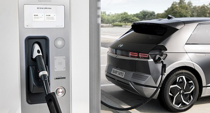 충전구 캡을 열고 충전 커넥터를 완전히 밀어 넣습니다. 충전기 화면에서 카드를 태그하거나 QR코드를 스캔한 후 충전 시작 버튼을 누르면 자동으로 충전이 시작됩니다.