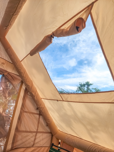 - 진짜 원터치 맞습니다: 텐트를 펼치는 데 5분도 채 걸리지 않았고, 펌프질 몇 번으로 텐트의 기둥 부분이 단단하게 올라왔습니다. 마치 마법처럼 텐트의 구조가 완성되는 것을 보고 감탄했습니다. 캠린이(캠핑+어린이)도 혼자 충분히 설치할 수 있는 수준이며, 설치 스트레스가 제로였습니다.