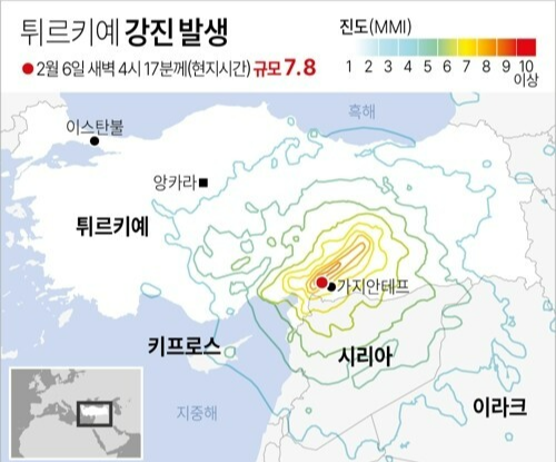 6일(현지시간) 오전 4시 17분 튀르키예 동남부에서 규모 7.8의 지진이 발생해 튀르키예·시리아 양국에서 최소 568명이 숨지고 수천 명이 다친 것으로 집계되고 있다.