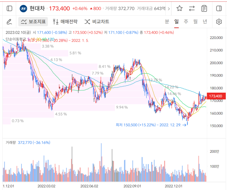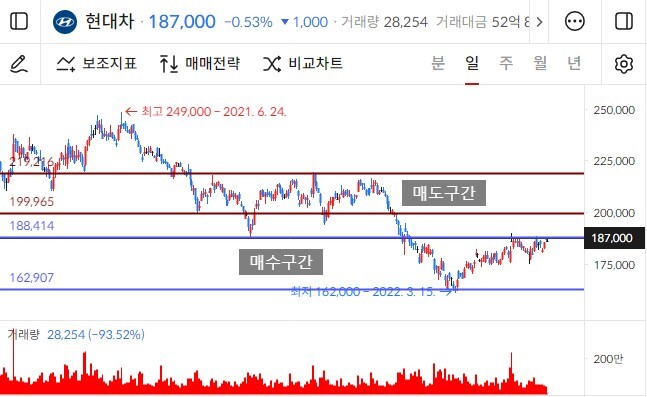 지만 역시 금리인상과 경기침체가 예상되는 상황에서는 현대차도 버틸 수 없었고 지속해서 하락을 보여줬던 주식입니다. 왠만한 대형주들에 비해서는 양반이긴하지만요.