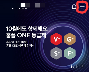 1. 홈플러스 앱을 열고 오른쪽 상단의 햄버거 메뉴를 누릅니다. (햄버거란 메뉴가 세줄로 되있어서 햄버거 모양같다 하여 붙여진 별명)