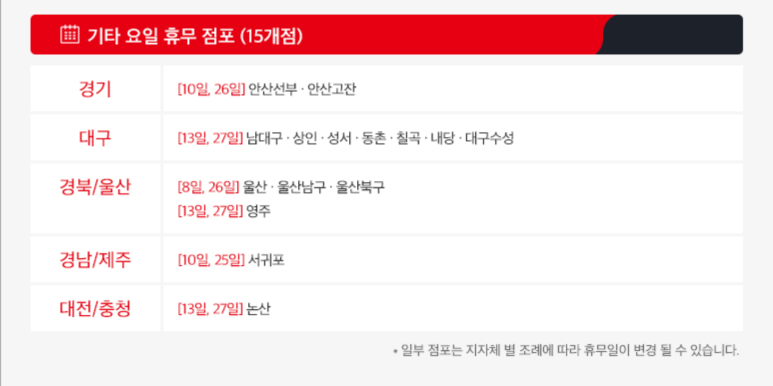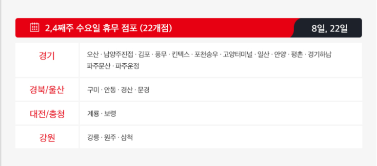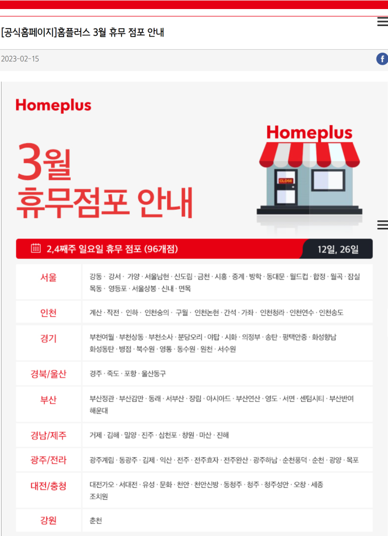 카테고리 없음 3월 홈플러스 휴무일 알아보기 by 라슈v 2023. 3. 1. 반응형 홈플러스 휴무일 안내 ★ 홈플러스 영업시간 오전 10:00시- 24:00시까지 ▶ 각 휴무일별 홈플러스 전국매장 ▶ 8일, 22일 : 홈플러스 전국매장 ▶ 기타 요일 홈플러스 전국매장 반응형 공유하기 게시글 관리 아이템카트 지식창고 저작자표시 비영리 변경금지 (새창열림) 댓글