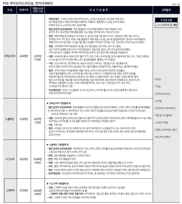 선택 가능한 트림은 다섯 가지로 가장 많이 선택하시는 노블레스와 시그니처 등급에 파노라마 선루프와 일부 인기 옵션을 추가하면 평균 4천만원 초반대로 출고됩니다.