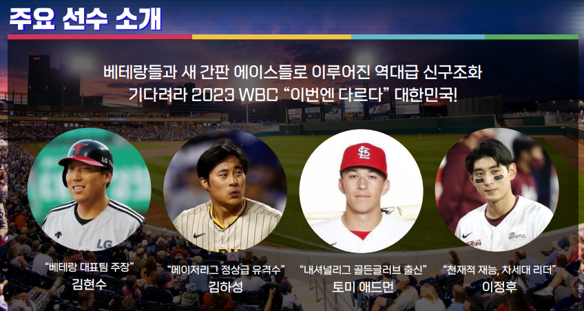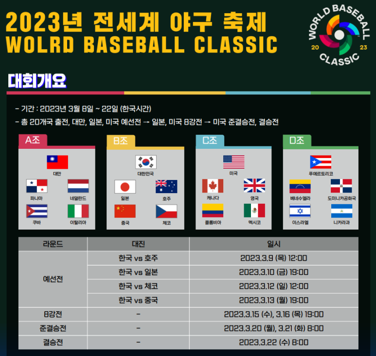 오늘은 곧 있을 2023년 전세계 야구 축제 WBC(World Baseball Classic) 경기 일정에 대하여 알아보도로 하겠습니다.월드베이스볼클래식에 출전하는 20개 팀 모두의 명단이 발표됐다. 2023년 토너먼트에 참가하는 메이저리거로는 샌디 알칸타라(도미니카 공화국), 피트 알론소(미국), 미겔 카브레라(베네수엘라), 프란시스코 린도르(푸에르토리코), 마이크 트라우트(미국)가 있습니다.